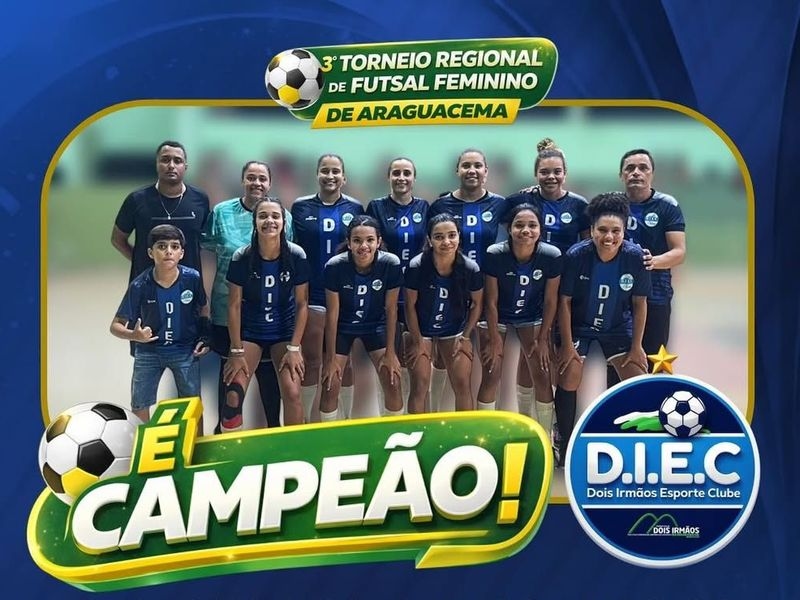 A Prefeitura de Dois Irmãos do Tocantins, por meio da Secretaria Municipal de Esportes e Juventude, celebra com grande entusiasmo a brilhante vitória da equipe feminina de futsal no 3º Torneio Regional de Futsal, realizado no município de Araguacema. Representando a cidade com excelência, o time do Dois Irmãos Esporte Clube (D.I.E.C) demonstrou garra e talento superior, conquistando o lugar mais alto do pódio.